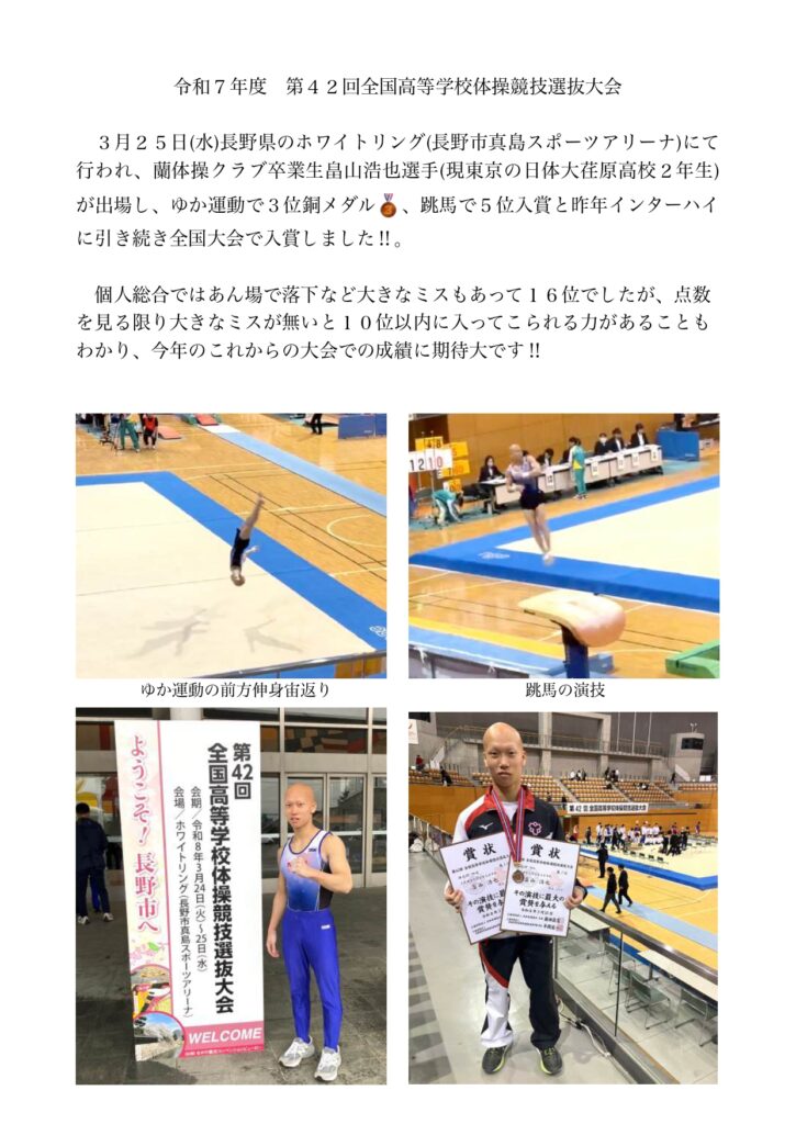 2026年3月25日「令和7年度全国高校体操競技選抜大会」が長野県ホワイトリングにて行われ、蘭体操クラブ卒業生の畠山浩也選手が出場して、ゆか運動で銅メダル、跳馬で5位と入賞しました! 大会結果は以下をご覧ください!